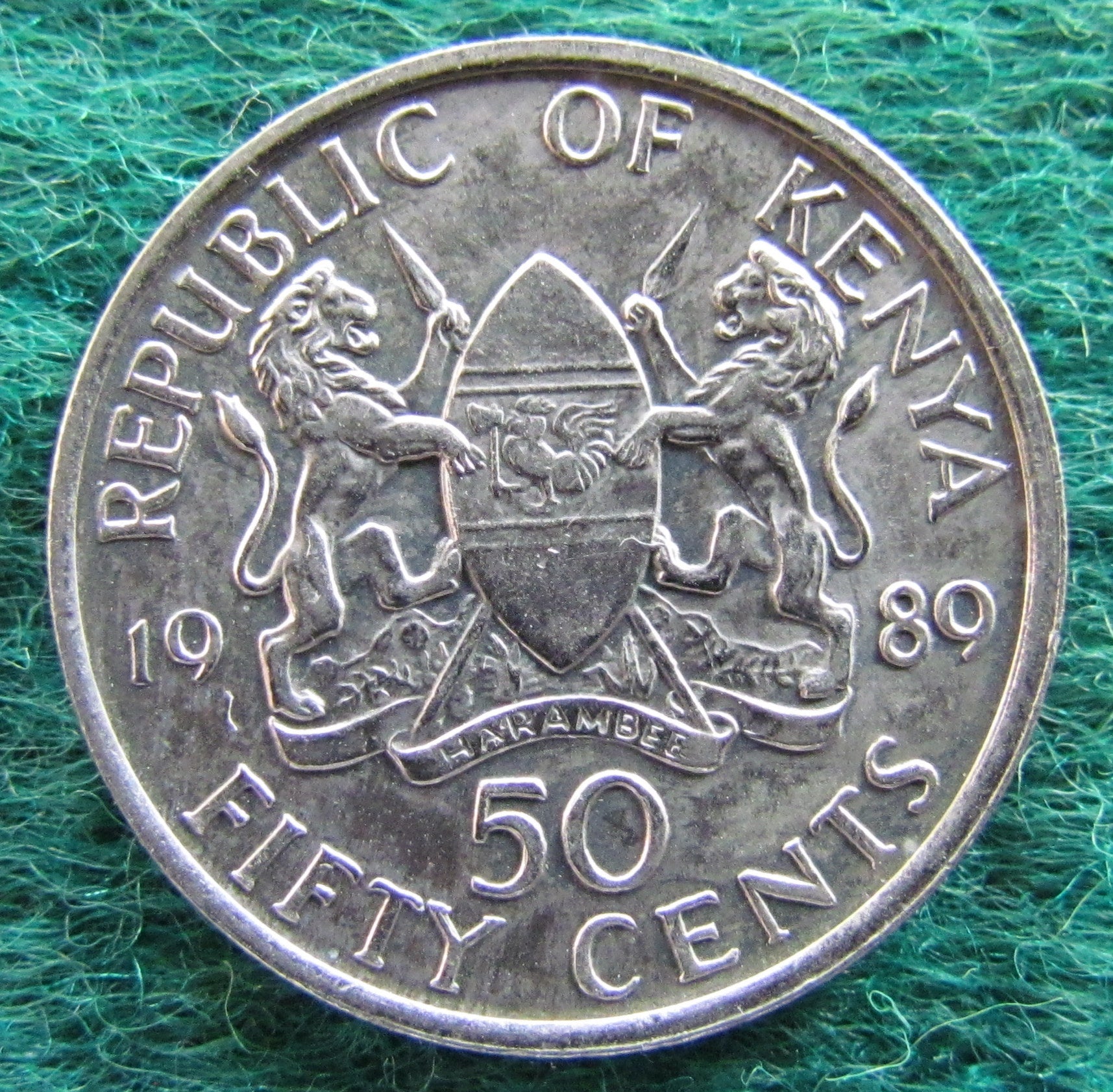 Republic Of Kenya 1989 50 Cents Coin. A good coin showing wear consistent with short term circulation and light handling. Please view images as all images are of the actual item.