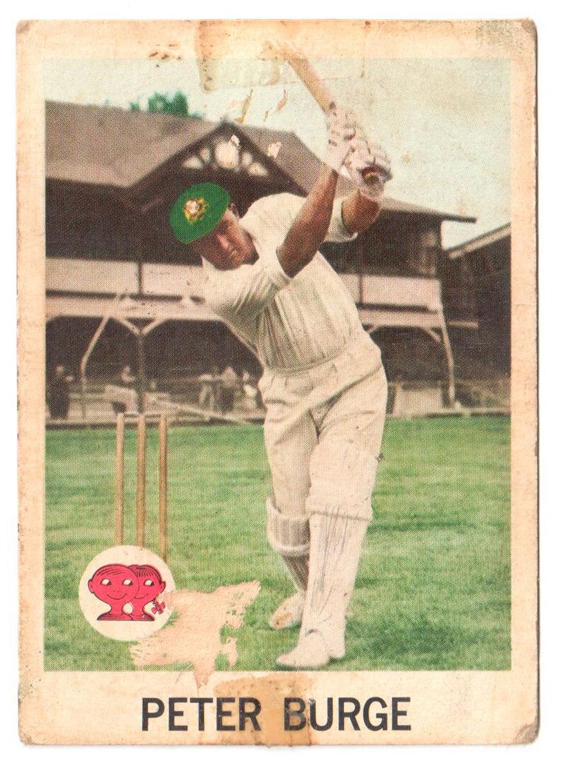 Scanlens 1965 Cricket Card #05 - Peter Burge. The card sticky tape marks, surface imperfections, discolouration, toning, bumped corners & edges and lastly possible creases, cuts or tears. Please judge this card for yourself from the images. All images are of the actual item.
