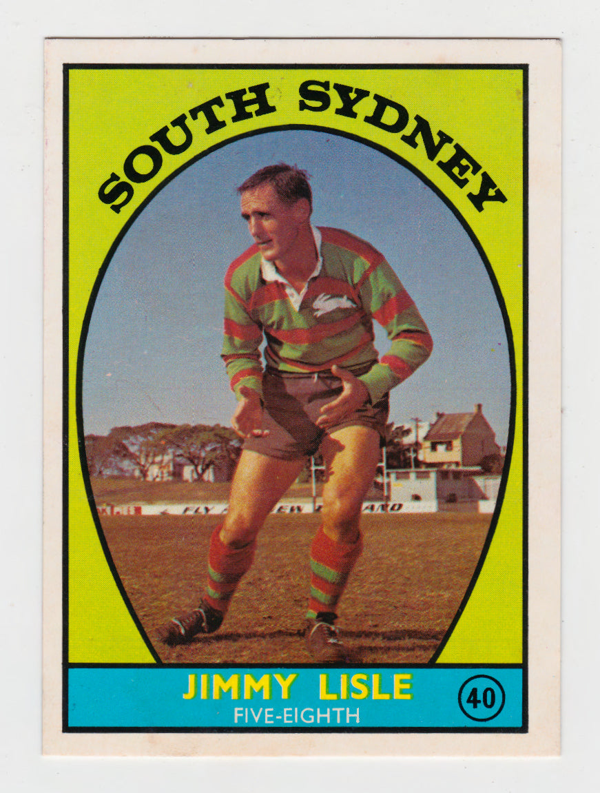 Scanlens 1968 A Grade NRL Football Card #40 - Jimmy Lisle - South Sydney. The card has a few surface marks. All images are of the actual item.