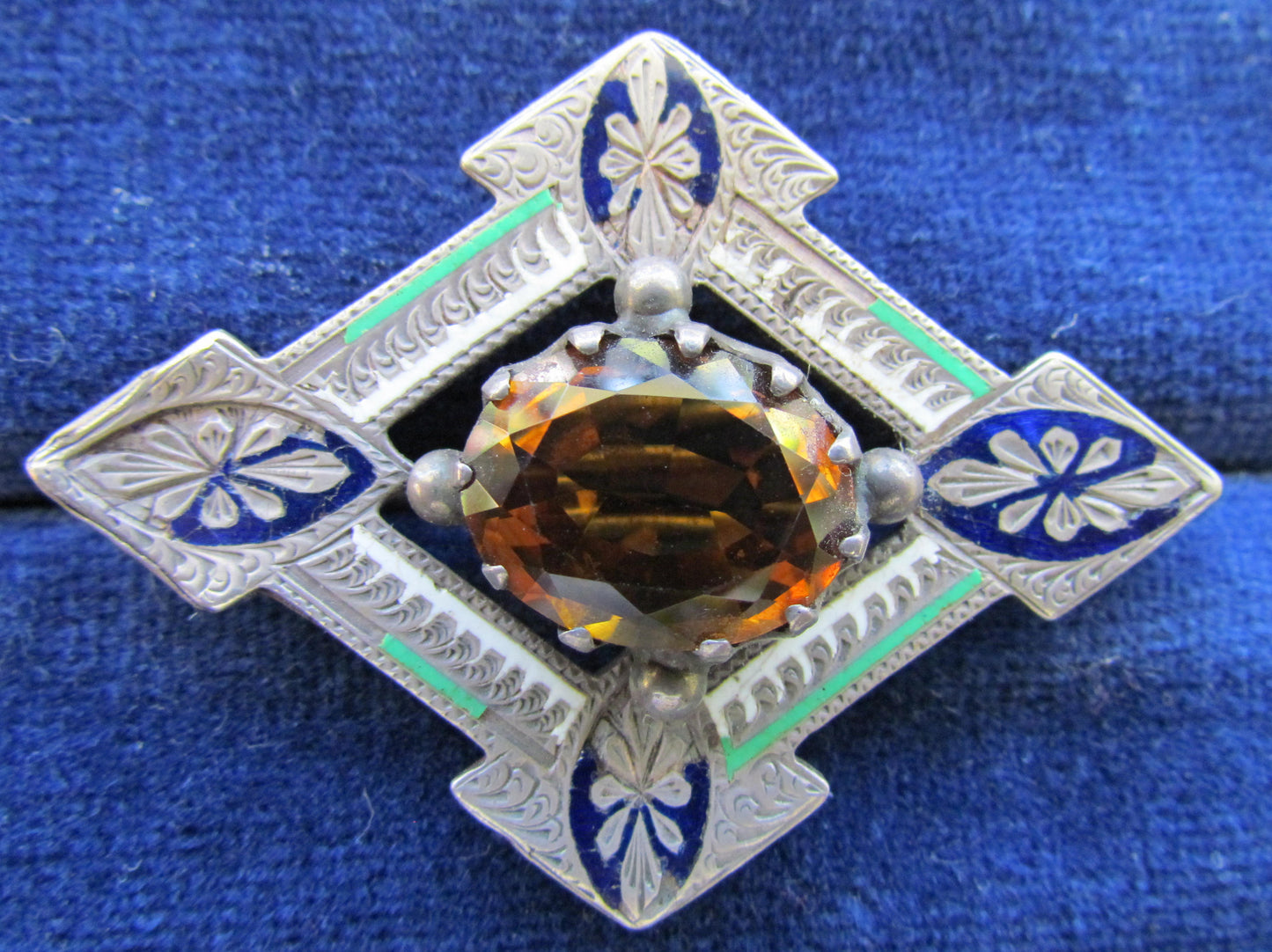 Silver And Enamel Claw Set Citrine Brooch Diamond registration Mark For 1867. Worn with damaged enameling. Please view images as all images are of the actual item.