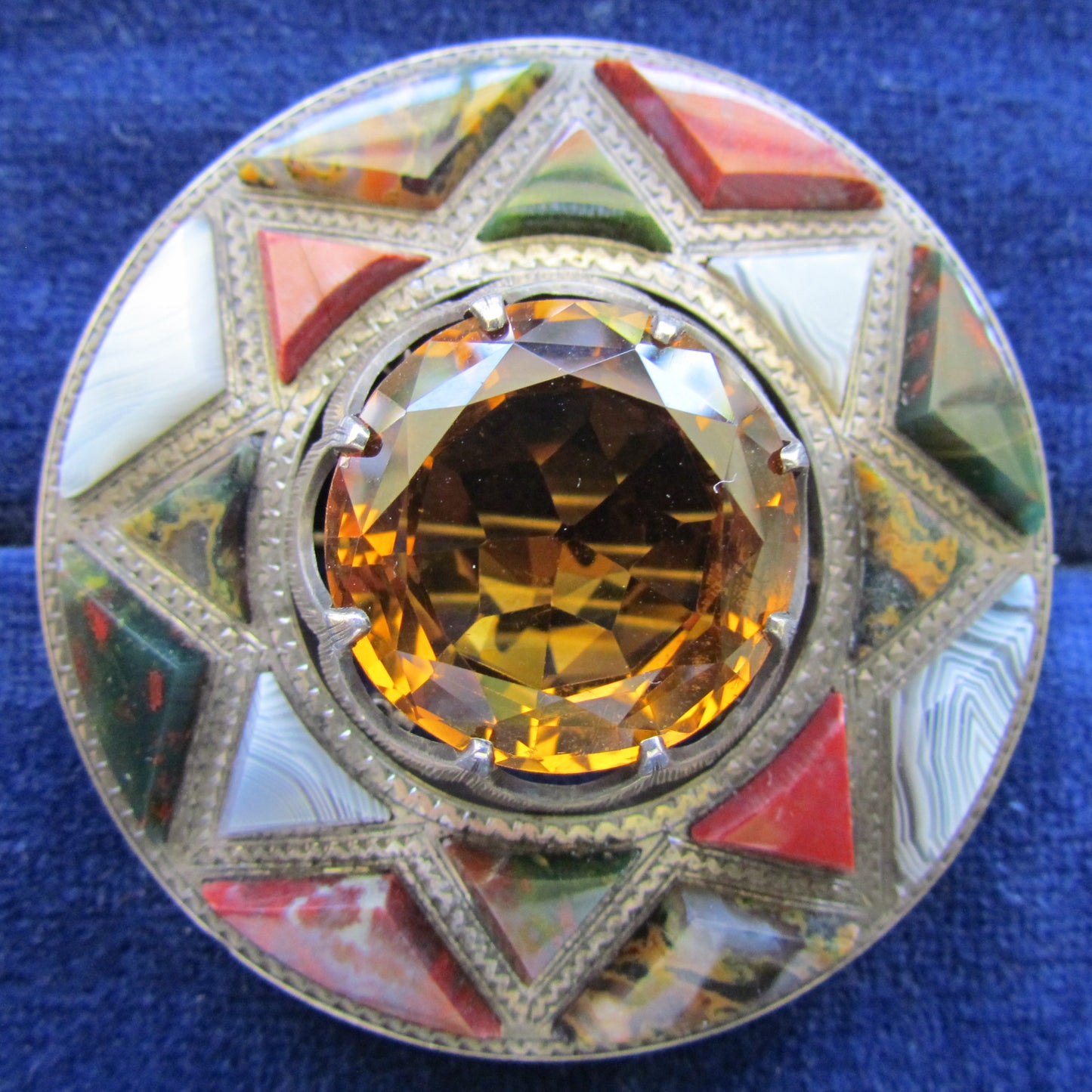 Silver Scottish Celtic Natural Golden Citrine & Agate Brooch Scarf Pin Pendant c1860 Unmarked. A very good quality brooch with a wonderful variety of coloured agate. Please view images as all images are of the actual item.