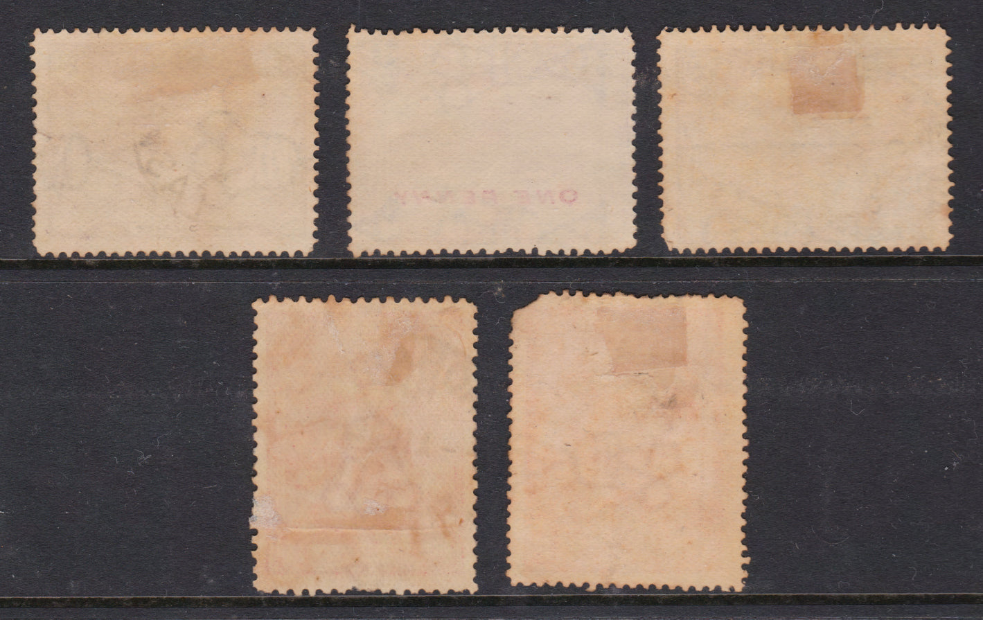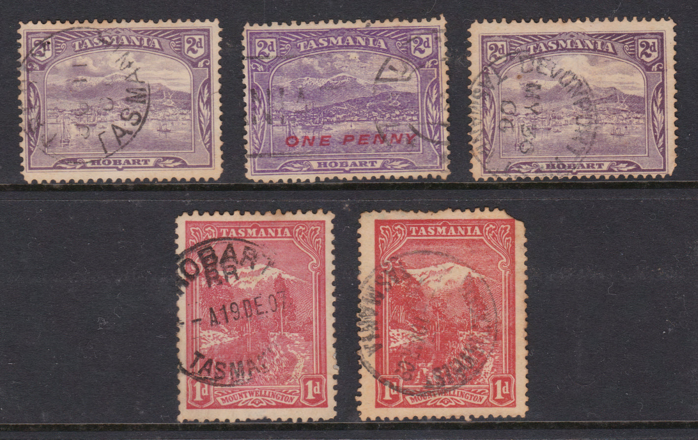 Tasmanian Mount Wellington & Hobart Stamp Collective. 1 Penny Red Mount Wellington x 2 one damaged. 2 Penny Violet Hobart 1899 x 3, one overprinted 'One Penny'. Remanent of hinges on some. All images are of the actual item.