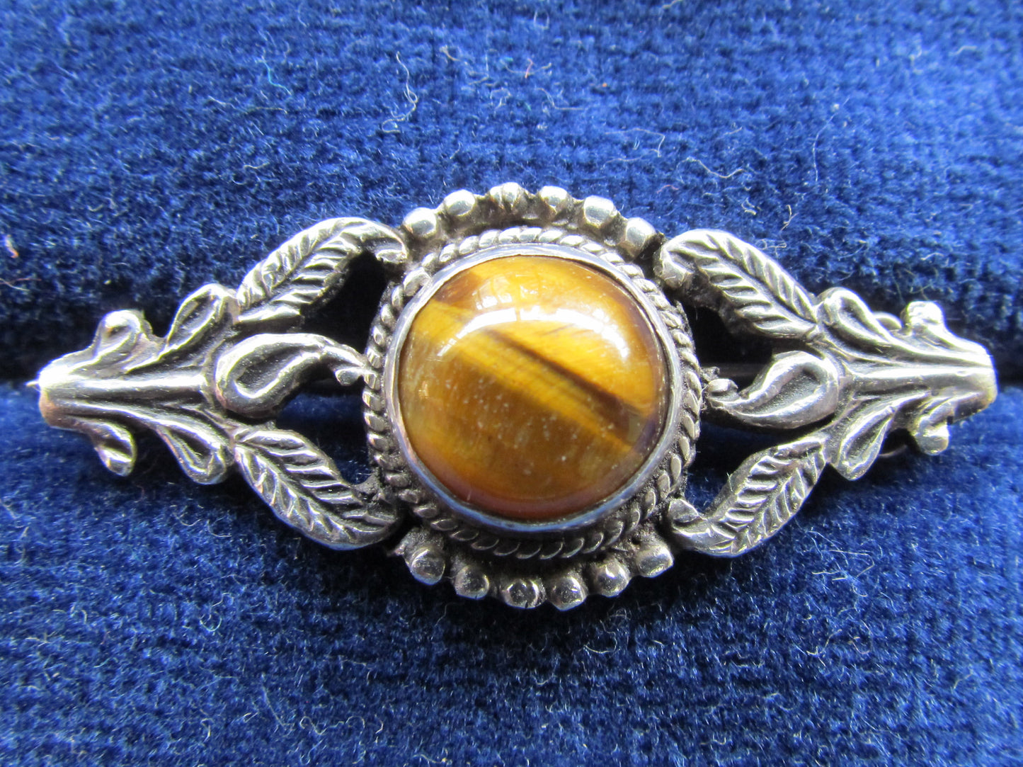 Unmarked Silver Tigers Eye Agate Brooch. Please view images as part of the description. Please view images as all images are of the actual item.