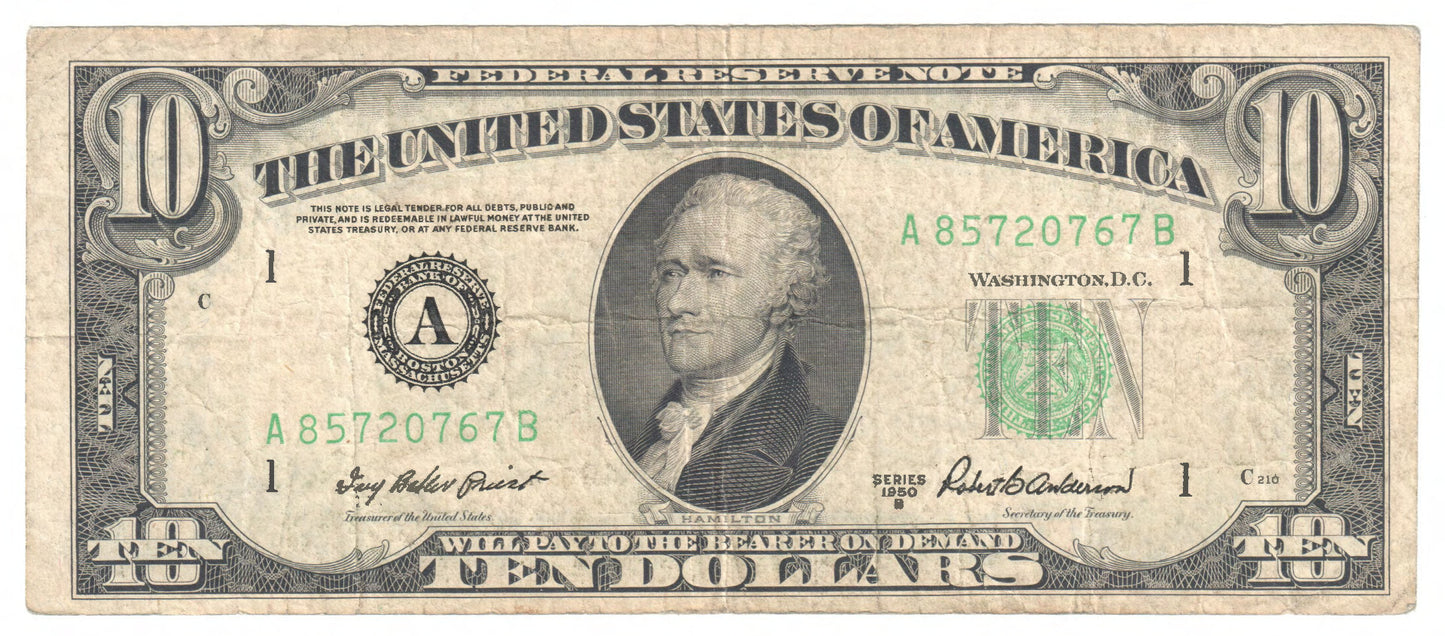 USA 1950 B $10 10 Ten Dollar Banknote Boston s/n A 85720767 B - Circulated. Signatories Priest & Anderson. This note has many folds, creases & wrinkles consistent with long-term circulation showing moderate to heavier discolouration. Please view images as all images are of the actual item.
