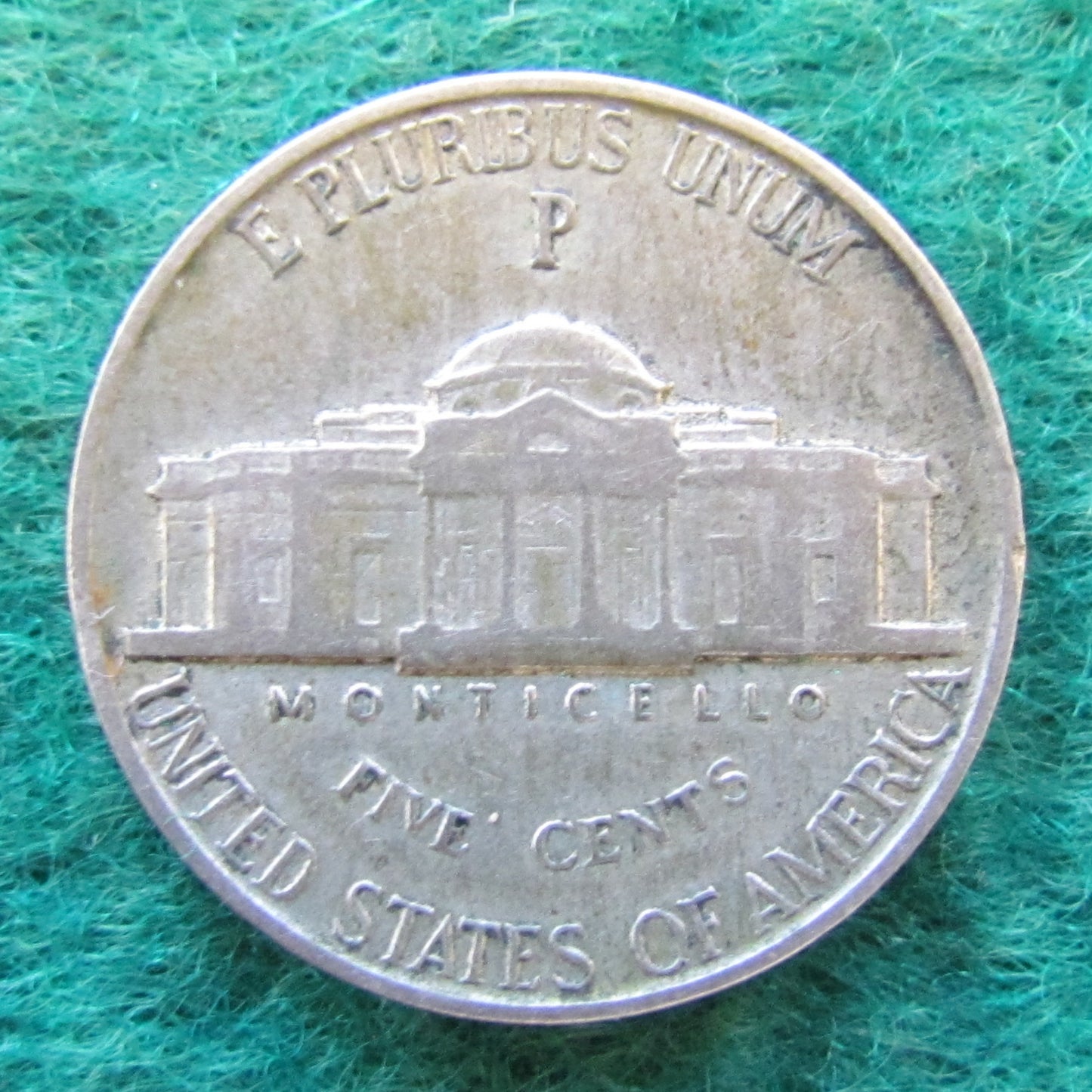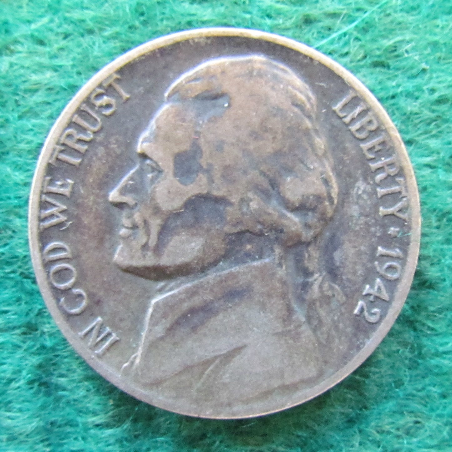 USA American 1942 P Nickel Jefferson Coin - Circulated. A good coin showing wear and tear consistent with a long period in circulation and a lovely deep coloured patination, please view images. All images are of the actual item.
