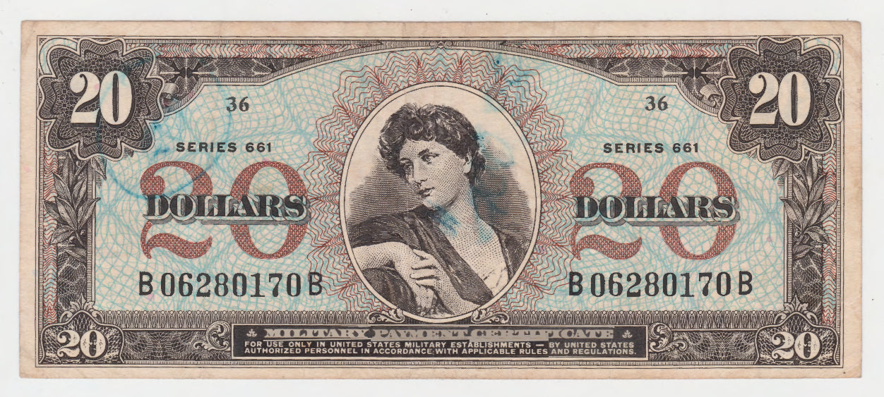 USA American 20 Dollar MPC Military Payment Certificate Series 661 Issue 36 s/n B06280170B. A good note with folds, creases & minor discolouration. Please view images as all images are of the actual item.