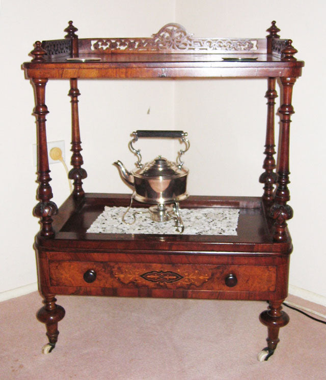Walnut veneered 2 tier what not with a drawer to the base standing on turned feet with original castors.